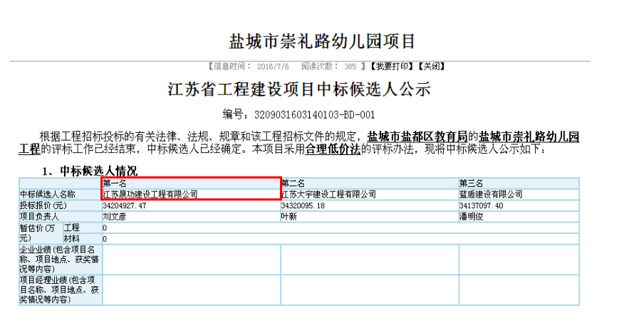 2016年7月6日,鹽城市鹽都區(qū)教育局的鹽城市崇禮路幼兒園項(xiàng)目中標(biāo)候選人公示,江蘇晟功建設(shè)工程有限公司以99.33分的成績位列第一名,7月12日中標(biāo)公示結(jié)果公布,晟功公司成功中標(biāo)。 本項(xiàng)目共計(jì)49家企業(yè)參與投標(biāo),經(jīng)過激烈競(jìng)標(biāo),晟功公司憑借優(yōu)質(zhì)的品牌信用、成熟的施工經(jīng)驗(yàn)、高效的質(zhì)量進(jìn)度保證體系及合理的報(bào)價(jià)贏得了招標(biāo)單位的青睞,并順利中標(biāo)。 此次中標(biāo)標(biāo)志著晟功公司在開拓市場(chǎng)的道路上又前進(jìn)了一步,晟功公司將繼續(xù)朝著蘇北龍頭企業(yè)的堅(jiān)定目標(biāo)而努力奮斗。 |