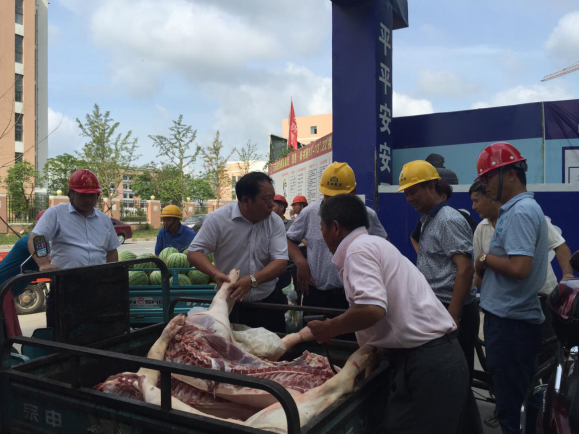 烈日炎炎,高溫持續(xù)。2016年8月4日,德惠集團(tuán)領(lǐng)導(dǎo)一行來到德惠· 尚書府項目施工現(xiàn)場,慰問工作在一線的員工們,并為他們送來了350多斤豬肉、3000多斤西瓜、80斤綠豆和40斤白糖。集團(tuán)領(lǐng)導(dǎo)詳細(xì)的了解工人們的生活作息情況,要求各負(fù)責(zé)人充分做好各項防暑降溫工作,保障安全生產(chǎn)。 連日來,阜寧地區(qū)氣溫居高不下,連續(xù)30多度的高溫肆虐著全城。集團(tuán)公司本著“以人為本”的理念,將防暑降溫工作列入重點,積極采取有效措施,杜絕因高溫引發(fā)的中暑或其它一切生產(chǎn)安全隱患,確保高溫期間職工的健康與安全。 本次“送清涼”深深激發(fā)了廣大職工的工作熱情,促進(jìn)了集團(tuán)公司的安全生產(chǎn),充分發(fā)揚(yáng)了德惠集團(tuán)“艱辛成就偉業(yè)、奮斗創(chuàng)造輝煌”的企業(yè)精神。希望工作在一線的廣大員工們能繼續(xù)頑強(qiáng)拼搏、迎難而上,在確保安全的基礎(chǔ)上圓滿完成工作任務(wù)。